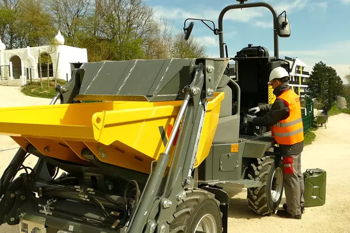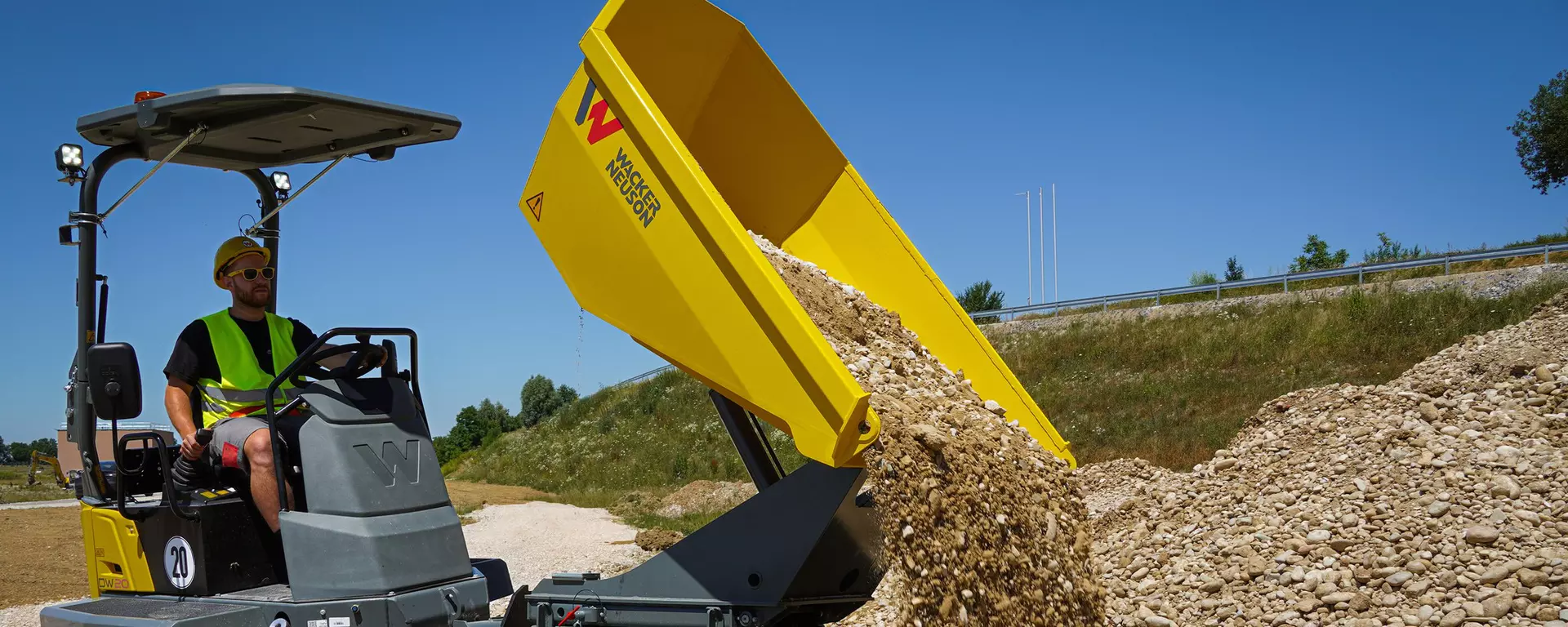 The hydrostatic 4-wheel drive of the DW20 guarantees good traction and machine control throughout the whole operation. The ideally shaped handles in direct reach of the operator provide the right support in any situation. The machine is equipped with tilt and skip monitoring ex works, which take safety to a new level with the hill-hold function and seatbelt monitoring. The optional start release for the seatbelt monitoring thinks and allows the machine to only then start operation if the seatbelt is applied after the operator sits down.